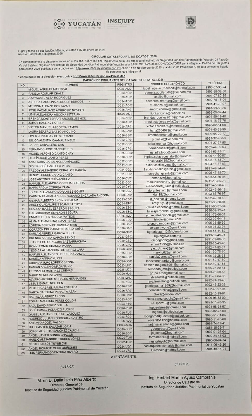 INSTITUTO DE SEGURIDAD JURÍDICA PATRIMONIAL DE YUCATÁN, A TRAVÉS DE SU DIRECCIÓN GENERAL Y DIRECCIÓN DEL CATASTRO PUBLICA LA LISTA DEL PADRÓN DE DIBUJANTES 2026